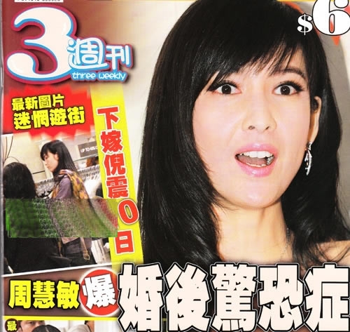 1月5日于香港跑馬地愛巢結(jié)婚,盛傳已懷了身孕的Vivian,由于老公形象受損工作大減,她1月13日惟有立即復(fù)工,到尖沙咀剪彩。被圍觀、忙賺錢,又怕倪震死性不改、第三者張茆何時(shí)現(xiàn)身搗亂,周慧敏承受壓力之大難以估計(jì),有傳她婚后情緒突變,更出現(xiàn)驚恐癥跡象,情況令人擔(dān)心。獲Vivian大量寬恕的倪震,是時(shí)候好好照顧老婆了。