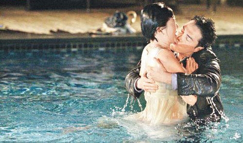 謝天華在泳池邊抱起李綺虹準備拉她下水。