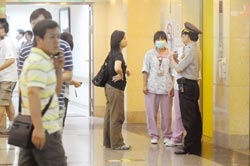 吳淡如昨在婦幼醫(yī)院緊急剖腹產(chǎn)子,醫(yī)院駐衛(wèi)警守住電梯口,防止媒體進(jìn)入。(康鴻志攝)