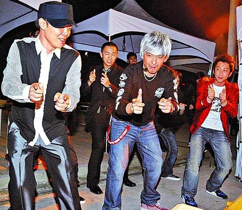 陳漢典(右起)、小鐘在后臺(tái)彩排歌舞為周董祝壽。