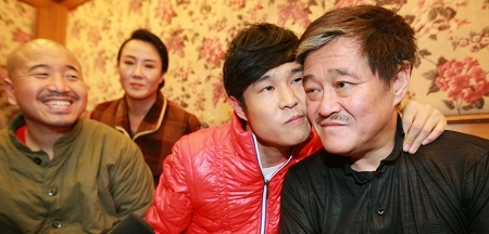 在今年春晚彩排期間,《捐助》的表演者王小利(左)等人接受媒體采訪,小沈陽(中)對師傅趙本山(右)表現(xiàn)親昵。