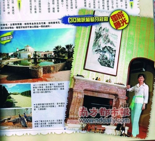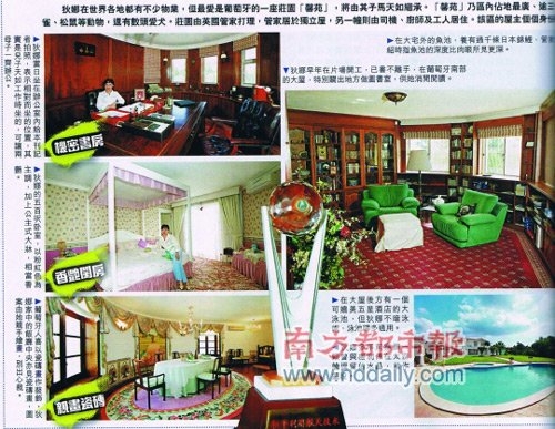 擁有龐大資產的狄娜,在世界各地都有物業,其中最為其所鐘愛的要數位于葡萄牙的一座莊園,名為“馨苑”。據悉,該莊園屬區內最大豪宅,全園面積逾30萬尺,單單狄娜的臥室便有五百尺,狄娜的臥室以粉紅色為主調,加上公主式大床相當香艷。主樓有兩層,分前后院:前院有金魚池及花叢,后院養有孔雀、松樹、狗狗等動物,而養孔雀是為了吃孔雀蛋。另外,后院還有一個可媲美五星級酒店的大型游泳池。據稱該區房主的身份個個顯赫,當地政府不會公開這一帶的資料。