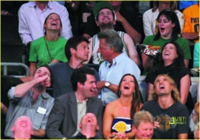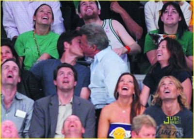 湖人隊日前在NBA總決賽力挫塞爾特人,令捧場的美國老牌男星達斯汀·霍夫曼十分興奮。當他發現大會鏡頭正拍攝自己時,即和鄰座后輩演員杰森·貝特曼親嘴。兩個年齡相差32年的大男人突然玩親親,弄得全場起哄,搶盡風頭。