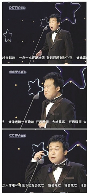 這個發布于國內某知名論壇的帖子曝料“青歌賽現場驚現‘表情帝’”,引起無數網友瘋狂圍觀。該網友稱“真沒有想到看CCTV青歌賽的美聲組比賽也會這么有樂趣,美聲組驚現‘表情帝’,僅僅一首曲目的演繹就已完全顛覆普通大眾對美聲的一貫呆板認識。其令人震驚的神態演繹貫穿整首歌曲,使曲目頓時充滿了多情的生命力,這一點是表情單一的春哥和神態呆板的曾哥需要無限努力學習的。”