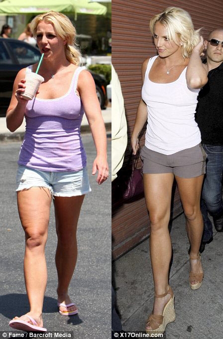 兩個禮拜前,被媒體拍到布蘭妮同樣是背心短褲的打扮,小天后絲毫沒有掩飾略顯邋遢負累的造型,大搖大擺地一邊喝冰咖啡,一遍逛街納涼,而長時間的遠離演藝工作的布蘭妮自然疏于對自己外形的管理,一雙浮腫松弛的大腿便是最好證據,而這一切都與昨天大方示人的曼妙曲線大相徑庭,不僅讓人揣測,為了再現昨日風采的小天后又在暗地里砸了不少銀兩。