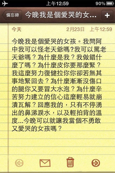 前天(2月21日)Selina的未婚夫“阿中”接受臺灣節目專訪,在提到Selina的復健狀況時,不禁掉下了男兒淚。在復健的路上,一直很認真努力的Selina似乎也遇到了一些瓶頸,讓她在今天(2月23日)凌晨痛哭崩潰,Selina在自己微博留下一句“今晚我是個愛哭的女孩。”,并附上一張由手機上傳的備忘錄照片,上面寫著:“今晚我是個愛哭的女孩。我問阿中我可以怪老天爺嗎?我可以罵老天爺嗎?為什么是我?我做錯什么了嗎?為什么皮你要那么緊?我這么努力復健拉你你卻若無其事地緊回去?為什么漸漸沒傷口的腿你又要冒大水泡?為什么辛苦建立的信心這么輕易就崩潰瓦解?響應我的,只有不停涌出的鼻涕淚水,以及輕拍背的溫度…今晚可以就讓我當個不勇敢又愛哭的女孩嗎?”