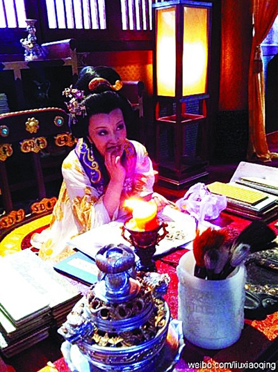 經常有演員在微博里抱怨說:“唉,演員最擅長的事情,就是無止境的等等等……”的確,片場拍戲,時間最難人為把控,各種各樣的原因都會延遲拍攝進度。而此時,下一場戲的演員已經化妝、發型完備,等候開工。昨天,在《武則天秘史》劇組拍戲的劉曉慶趁等戲空當微博發布“李治仰天長睡圖”、“武則天嗑瓜子”兩張有趣花絮照。