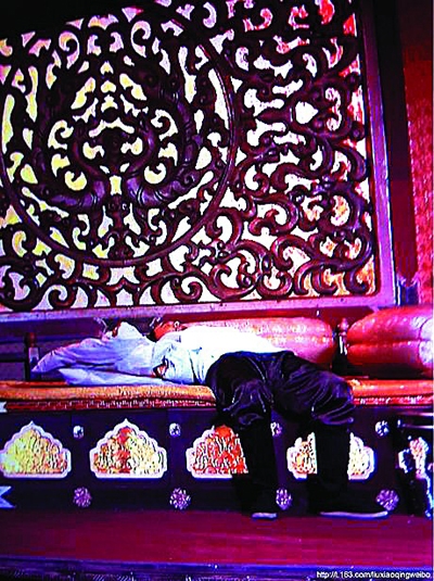 20日清晨七八點,正在《武則天秘史》拍戲的劉曉慶,微博發布兩張工作花絮照,有別于其他明星公布的后臺美照,劉曉慶發布的兩張照片很有娛樂精神。一張中,她戴著發套,穿著華貴,不過此時,“武則天”沒有日理萬機,而是“穿越”到現代,有滋有味嗑著瓜子。劉曉慶配上圖片說明:“拍攝現場等候時,吃瓜子是一種樂趣。當然最要注意的是,不要讓化妝師毛戈平看見。不然,他又要眉眼皺成一團地對我雞叫鵝叫了。很敗壞我的名譽的。噓……”“暴露”自己不說,幾分鐘后劉曉慶微博又出現一張照片,演員趙文瑄的“李治仰天長睡圖”,四仰八叉倒在片場的床榻上,如此豪邁地“小憩”,劉曉慶打趣地說:“當然,在拍攝現場等候時瞇一覺,是最好的方法。(請注意:這是溫文爾雅的趙文瑄哦)”
