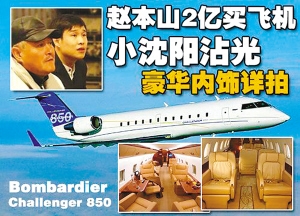 2009年,趙本山斥資2億元為自己訂購一架豪華座機,據悉,趙本山訂購的這架小型公務機產自加拿大龐巴迪公司,屬于該公司旗下著名的“挑戰者Challenger 850”系列。為了方便與工作人員以及徒弟們出行,趙本山特意在飛機內安排了17個座位。