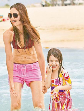 阿湯哥前陣子在邁阿密拍攝歌舞片《搖滾年代》(Rock of Ages,暫譯),日前已殺青。凱蒂帶女兒蘇瑞去探班,母女倆上周六到海邊踏浪,凱蒂難得穿比基尼亮相,彎腰露出松垮肚皮,以及密密麻麻的妊娠紋,讓人看傻眼。