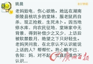 知名女星姚晨6月24日發出一條微博消息,稱其母親的堂妹因不滿當地水庫征地補償標準服老鼠藥自殺。此條微博一出即引起廣泛關注。為不讓“家人擔心”,姚晨刪除了該條微博。據姚晨微博透露,目前其輕生的堂姨媽已經脫離危險。