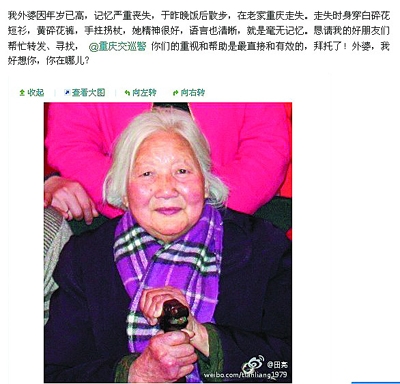 田亮在微博上很詳細地描述了外婆的體貌特征,并附上了照片:“我外婆因年歲已高,記憶嚴重喪失,于昨晚飯后散步,在老家重慶走失。走失時身穿白碎花短衫,黃碎花褲,手拄拐杖,她精神很好,語言也清晰,就是毫無記憶。懇請我的好朋友們幫忙轉發、尋找。”除此之外,田亮還特別請求重慶交巡警的官方微博給予支持。