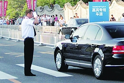前天下午4時許,記者趕到劉老根會館附近,看到寫著“快速公交專用道”的車道口處立著一塊寫有“嘉賓專用車道”的牌子,4名身穿白色襯衫的男子頂著烈日,站得筆直,不斷地對著從遠處駛來的轎車敬禮,并指揮這些車從“專用道”走。 記者觀察了20分鐘,看到三輛從南邊駛來的快速公交1號線走到原本屬于自己的“專用道”前,突然被指揮著改走邊上的普通車道。其中一輛車的司機顯然“沒有思想準備”,一下子反應不過來是怎么回事。他駕駛的公交車也停了一下,隨后才向右打輪駛進右側的普通車道。