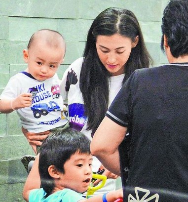 張柏芝(右)昨在香港一手抱著小兒子Quintus,一手牽著大兒子Lucas(前排左)逛超市。