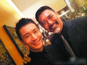 黃曉明在微博貼出與發哥的合照,有網友笑言,是兩代許文強聚首。