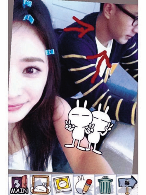楊冪還上傳了一張自拍的與劉愷威一起的照片,照片中楊冪打扮粉嫩,頭上有三個發夾,十分可愛,后面的劉愷威充當背景,戴著眼鏡低頭在研究什么。楊冪還在照片上貼上兩只親密的兔斯基,并涂鴉上兩個小紅箭頭指向劉愷威。