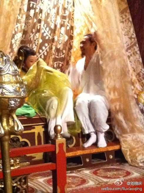 照片中,被劇迷認為最具喜感的一張,是劉曉慶與“皇帝”趙文瑄就寢的照片,女主角還配有文字注明:“我和趙文瑄,床戲時笑場