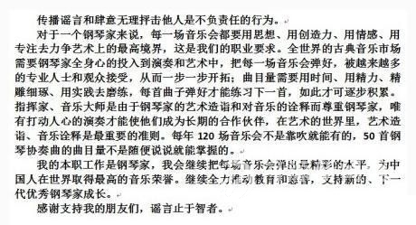 在聲明的最開始,郎朗便斥責“傳播謠言和肆意無理抨擊他人是不負責任行為”,稱對一個鋼琴家來說,每一個場音樂會都要用思想、用創造力、用情感、用專注力去爭取藝術上的最高境界,這是職業要求。此外,他表示,“在藝術世界里,藝術造詣、音樂詮釋是最重要的準則,每年120場音樂會不是靠吹就能有的,50首鋼琴協奏曲的曲目量不是說說就能隨便掌握的。”最后,郎朗還表示謠言會止于智者。