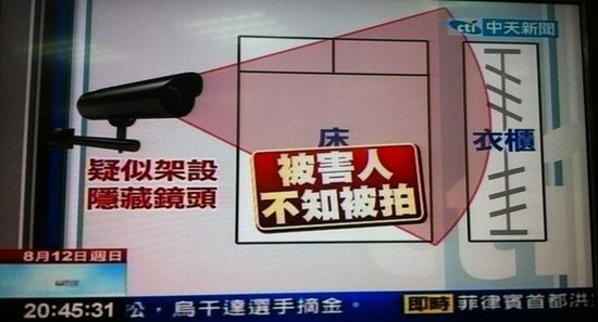 以照片上拍攝角度可看出,李宗瑞房內床邊有一整排衣柜,隱藏式鏡頭疑放置在床的另一面,而被害女子似乎也不知道自己早已全裸入鏡;而其房內擺設也與前女友的說法一樣,前女友先前在受訪時曾表示,看過自己李宗瑞在電視、電腦前裝東西,當時也沒起疑心,還問他在干嘛,現在才知道原來有攝影機在偷拍。