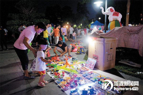 晚上8 時(shí)多,記者來(lái)到茶山公園,只見(jiàn)游人如織,熱鬧非凡,且多是大人帶著小孩子。公園里,眾多的小攤檔占據(jù)道路兩側(cè)和廣場(chǎng)空地,只在中間留下了約2.5 米寬的通道讓游人行走,茶山公園成為了名副其實(shí)的夜市,而這個(gè)夜市更貼切的名字是“兒童游樂(lè)園”。