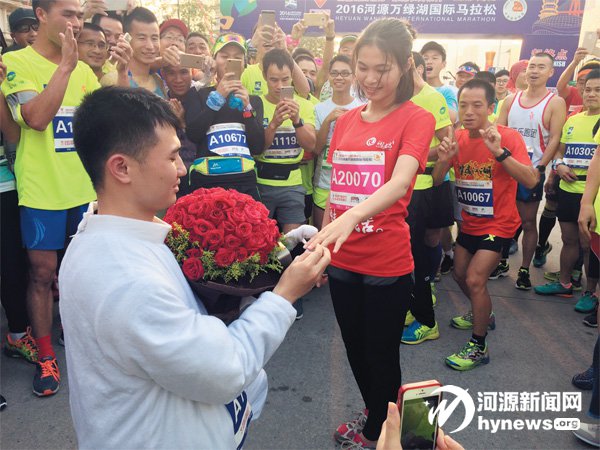 用一場奔跑結束多年的愛情“長跑”,步入婚姻的殿堂,是不是你能想到“最浪漫的事”?來自市中醫院的朱先生在“河馬”迷你馬拉松項目中,身著禮服,手拉穿著雪白婚紗的未婚妻李小姐幸福地向前奔跑,在眾人祝福的目光下沖向終點。朱先生說,他們的婚禮就在“河馬”之后的一兩天內舉行,這次活動給他們愛情的終成正果獻上了最值得紀念的禮物。