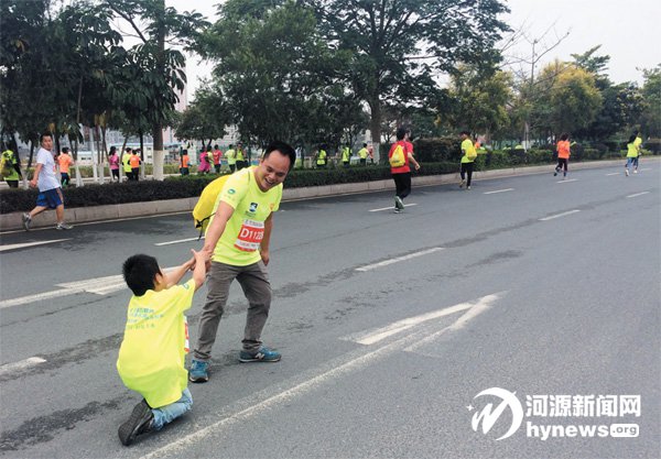 本次“河馬”比賽中,有不少暖心故事上演。在2 公里親子跑過程中,不少家長都是拉著孩子的手,鼓勵孩子們不斷奔跑。在離終點只有50 米時,一位小朋友體力不支累倒在地,爸爸伸出手拉起兒子,鼓勵他要堅持,不能放棄,然后父子并肩沖向了終點。還有一位叫葉子的媽媽,她是用嬰兒車推著一雙只有4 歲和2 歲的兒女跑完了親子跑。