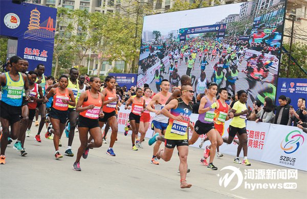 昨日上午,2016 河源萬綠湖國際馬拉松在堅基購物中心鳴槍開跑,約1.5 萬名國內外參賽者奔跑在客家古邑綠潮涌動的賽道上,共同領略大美河源的自然風光、城市魅力,于萬綠湖畔掀起馬拉松熱潮。最終,來自中國的哈斯木汗、李子成戰勝了強大的“非洲軍團”,分別斬獲全程馬拉松男子一、二名,哈斯木汗跑出2 小時15 分23 秒的“河馬”全馬項目最好成績。