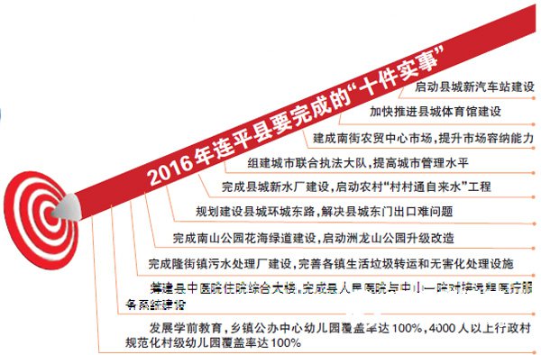 2016 年,連平將圍繞“山水宜居旅游城市” 的定位,繼續(xù)擦亮“全國文明縣城”品牌。加快城區(qū)擴容步伐,重點加大富民新區(qū)、文化西區(qū)和南湖片區(qū)的開發(fā)力度,加快省道S341 線南移步伐,盡快貫通富民三路和新城東路、新城西路;同時,加快推進縣城體育館、新汽車站、新水廠、威斯達酒店和連中擴建等項目建設,盡快完成“十字街”改造和農(nóng)貿(mào)市場建設,完成迎賓大道和縣城一河兩岸升級改造。