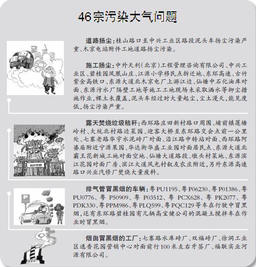 相關(guān)熱詞搜索:百日 大氣 力度 據(jù)悉,這46 宗污染大氣問(wèn)題涉及市公安局、市住建局、市城管局和源城區(qū)、江東新區(qū)、高新區(qū)、東源縣管轄處理。其中,道路揚(yáng)塵兩宗,施工揚(yáng)塵7 宗,垃圾秸稈露天焚燒18 宗,機(jī)動(dòng)車冒黑煙14 宗,泥頭車超限遺撒1 宗,工業(yè)污染4宗。