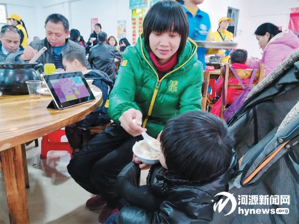 12 時,午餐正式開始。現場一片歡聲笑語,暖意融化了冬季寒意。小欣今年3 歲半,兩年前她從床上摔了下來,頭部受傷導致現在還無法說話、走路。她坐在嬰兒車上,前面的桌子上擺放著一個播放著動畫片的平板電腦,媽媽在給她喂飯。小欣的媽媽說: “如果不放動畫片,她就坐不住。”5 歲的小萱是一個自閉患兒,目前在康華康復中心做康復,她不愿意講話,臉上也沒有太多表情,但是她媽媽說:“小萱今天明顯很開心哦。”媽媽臉上的表情充滿了欣慰。
