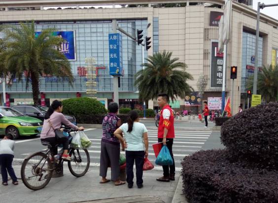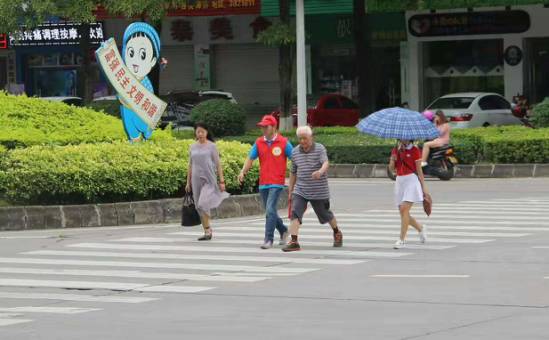 他們手持小紅旗,臉上帶著微笑,耐心地攔下那些想闖紅燈的匆忙步伐,幫助有需要的老人、小孩、殘疾人、孕婦和提重物的行人安全通過馬路,熱情為市民、游客提供咨詢服務……成為了一道亮麗的風景線。