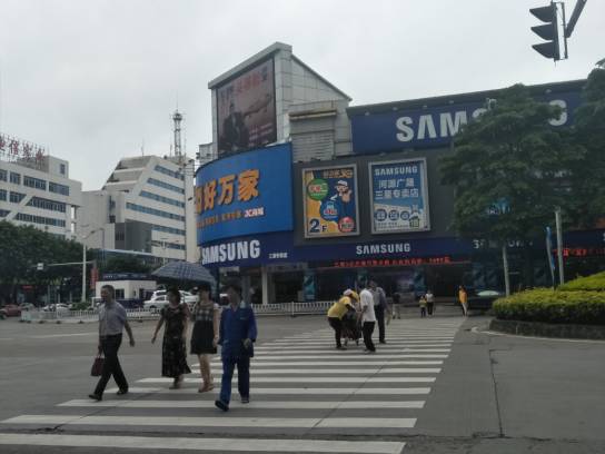 河源市益剪志愿者服務隊的志愿者幫過馬路的行人提重物