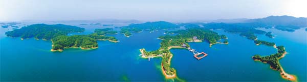 天上瑤池水,人間萬綠湖。萬綠 湖,就像一塊碩大的藍寶石鑲嵌在天 地間,浩瀚遼闊、氣勢恢弘,比起大海 的不羈,河流的靈動,萬綠湖像一個大 家閨秀,溫柔婉約、嫵媚動人,煙波飄 渺而波瀾不驚;顯得靜謐、空靈,深邃 寬廣而謙恭淡定。