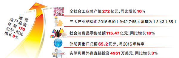 據悉,該區今年將新增1 平方公里的工業用地,著力提升接納能力,為更多的項目落戶“筑好鳳巢”。會議下發了關于今年要開展產業大會戰等 “七大行動”的實施方案,并提出了今年產業發展的新目標:地區生產總值達到170 億元,同比增長9%;三大產業結構由2016 年的1.9:42.7:55.4 調整為 1.8:43.1:55.1;全社會工業總產值272 億元,同比增長10%;社會消費品零售總額115.47 億元,同比增長10%;實際利用外商直接投資4951 萬美元,同比增長3%;外貿進出口總額65.2 億元,與2016 年持平。
