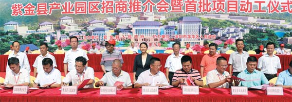 9 月29 日,紫金縣產業園區正 式開園,首批入園項目8 個,總投資 21 億元,是全省57 個產業轉移工業 園中第一個實現“當年開工、當年 建設、當年開園”目標的園區。