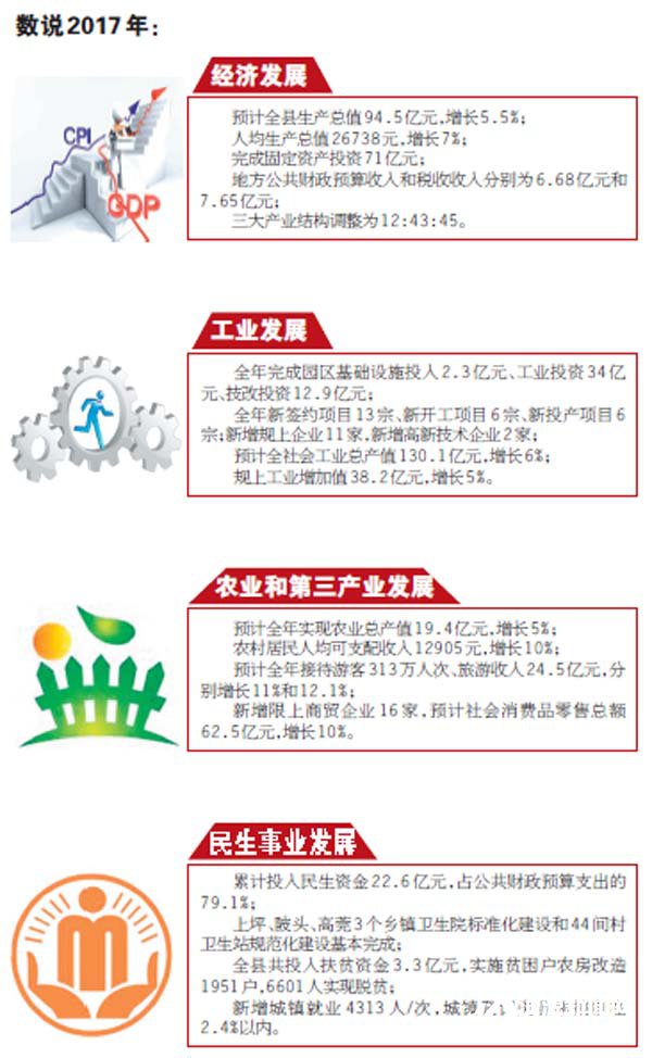 2017 年是黨的十九大勝利召 開之年,也是連平縣加快振興發(fā) 展、積蓄發(fā)展后勁的重要一年。過 去一年,對連平也是碩果累累,幸 福倍增的一年:汕昆高速連平段如 期建成通車、縣城“十字街”竣工使 用、成功通過了“廣東省縣級文明 城市”復檢、采茶戲成功入選省級 非遺項目、6601人實現(xiàn)脫貧……