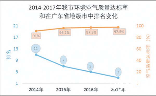 空氣質量達標率穩步提升,2014、2015、2016、2017年環境空氣質量達標率依次為91% 、96.2% 、97.3%、97.5%;空氣質量在全省綜合排名中分別位列第11名、第7名、第5名(與惠州并列)、第3名(與茂名并列)。
