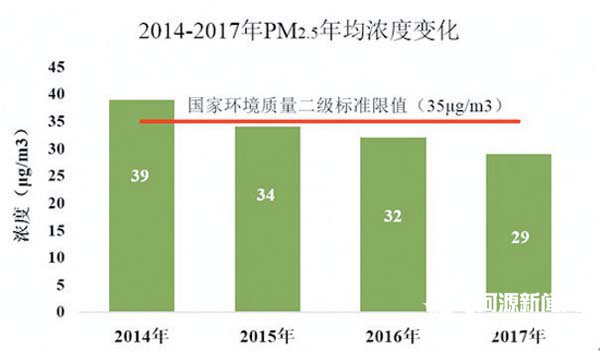 主要空氣污染物濃度值連續4 年下降。其中,PM10濃度由2014年的 58 g/m3下降到2017 年的48 g/m3, PM2.5 濃度由2014 年的39 g/m3 下 降到2017 年的29 g/m3,各項污染 物濃度均值達到年均濃度限值二級 標準(GB3095-2012),其中SO2、 NO2 濃度均值和CO第95 百分位數 達到年均濃度限值一級標準 (GB3095-2012)。