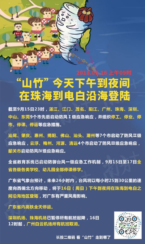 【河源今天大雨到暴雨】強臺風“山竹”,16日09時位于距離廣東省江門臺山市,東偏南方向約310公里海面上,中心附近最大風力15級(48米/秒),未來將以每小時30公里左右的速度,向西偏北方向移動,強度維持。16日下午到夜間,以強臺風級(14級-15級)在珠海到電白之間沿海地區登陸,較大可能16日傍晚前后,登陸陽江到臺山沿海。