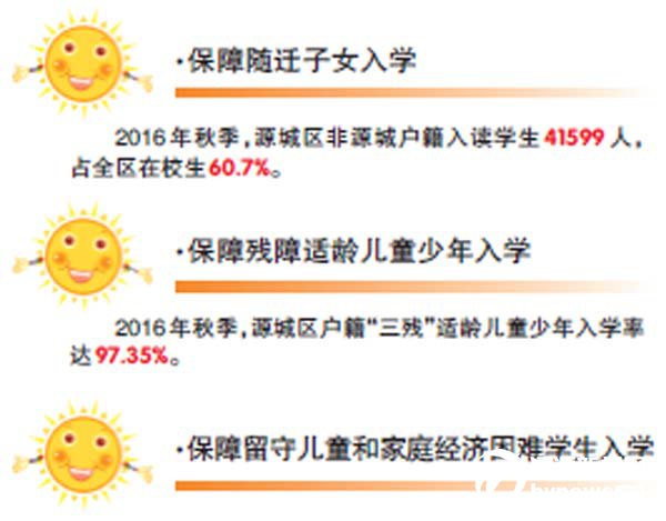 源城區堅持“ 以人為 本、教育惠民”的教育理念, 著力解決群眾最關心的教 育問題,確保教育公平,堅 決落實公辦義務教育學校 免試就近入學和民辦學校 免試入學原則,100%公辦義 務教育劃片就近入學。所 有公辦中小學均實行網絡 平臺招生,以“ 機控”減少 “人為”,招生錄取數據直接 與學籍管理系統對接,進一 步規范了義務教育階段學 校招生行為。