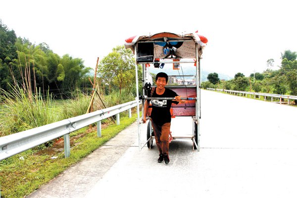 有了這個想法以后,原曉兵在五金店買了一輛板車,隨后對板車進行改裝,在板車上方加裝了一個用鐵皮做的箱子,以方便自己在里面存放帳篷被子以及炊具等物品。板車前面加裝了擋雨棚。擋雨棚上方裝上一塊太陽能板,用于手機充電以及晚上照明的LED充電。一切準備就緒后,原曉兵4月16日從玉林市出發往廣州市方向走,然后從廣州—福州—杭州—上海—南京—濟南—北京—石家莊—太原—介休。全程7000多公里,預計今年11月份可以走到家鄉。原曉兵說,家人對自己這次徒步活動還是很支持的。自己有個兒子已經出來工作了,目前在深圳上班,兒子對自己的徒步活動也表示支持。
