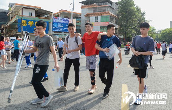 上午8時許,在河源中學考場,一名左腿受傷的考生被兩名同學攙扶著走進考場,還有另外兩名同學護送左右,其中一人手中提著該考生的拐杖······這幅溫情畫面令人動容。