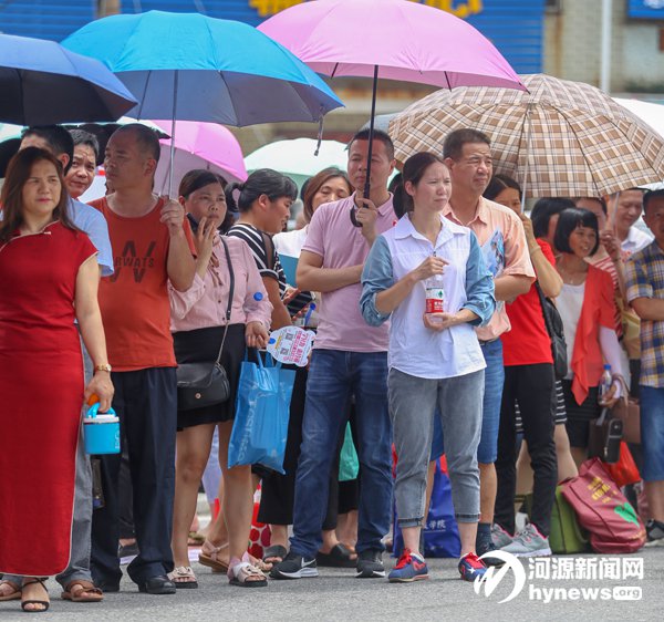 同樣的情景也在其他考點上演。烈日灼灼,在考試結束前半個小時,河源中學考場外就已經形成了一條“長龍”,這些都是送飯或者接考生的家長。他們大多是全家齊出動。家長譚女士告訴記者,自己早上六七點鐘就去市場買雞殺雞煲湯,花了一個上午的時間給兒子準備營養餐。