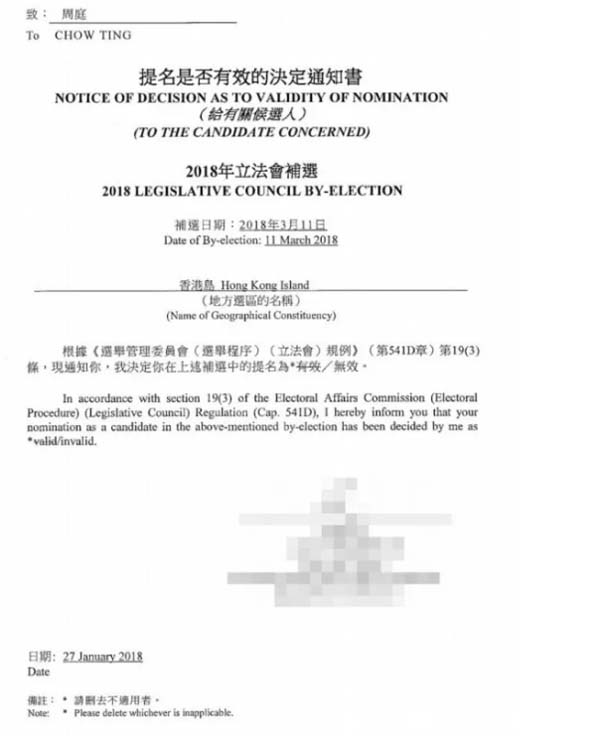 2018年1月,擬參加港島區(qū)立法會補選的周庭,被選舉主任以不擁護《基本法》及效忠香港為由,取消參選資格