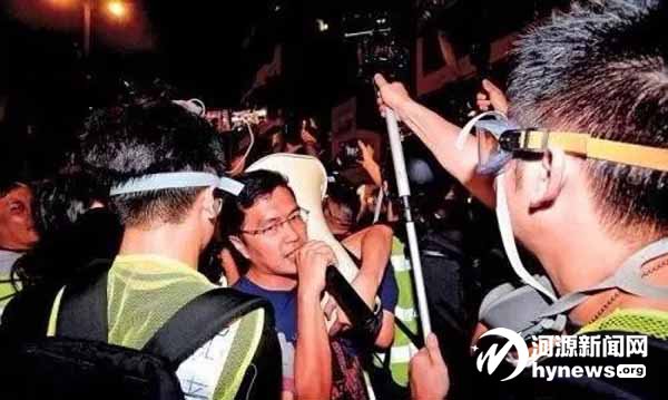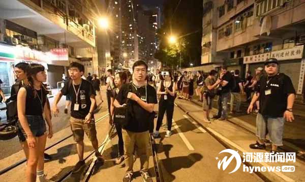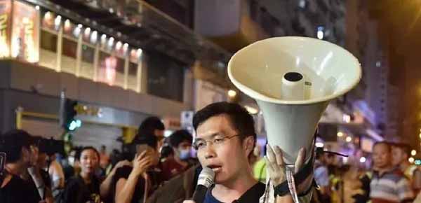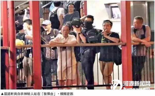 在這場騷亂中,區(qū)諾軒赫然站在天橋的“指揮臺”上,他還不時地與一名白衣神秘男子密語,時刻關(guān)注形勢變化,并通過周邊人隨時傳達(dá)指令。