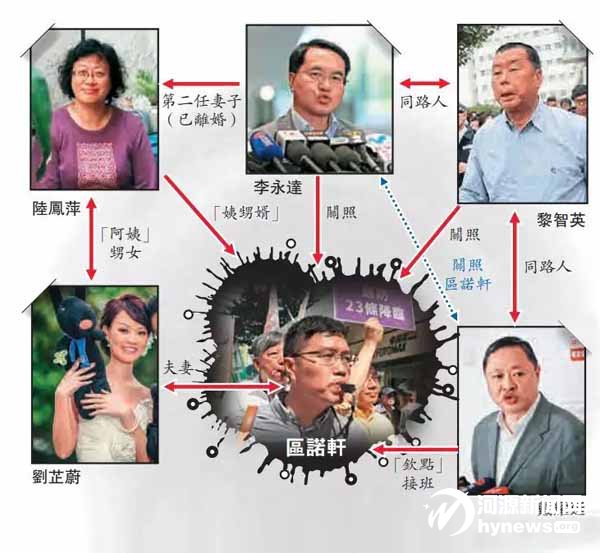 借助裙帶關(guān)系上位后,區(qū)諾軒迅速成為反對派的“明日之星”。李永達(dá)“愛屋及烏”,對于前妻陸鳳萍推薦上來的區(qū)諾軒自然頗為關(guān)照。區(qū)諾軒還獲得黎智英的“祝福”,以及“占中搞手”戴耀廷的信任。