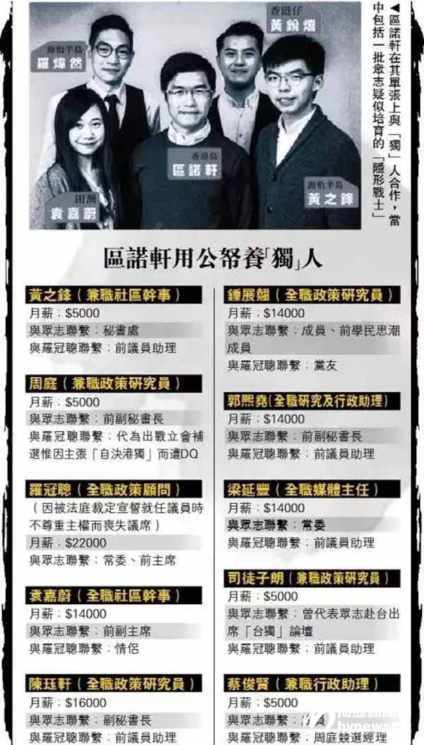 根據(jù)議員開支申報(bào)資料顯示,區(qū)諾軒每月花掉9萬元公帑,以“天價”聘用“眾志”7名核心成員擔(dān)任其“助理”。其中,羅冠聰為“全職政策顧問”,月薪2.2萬元;羅冠聰?shù)呐选?ldquo;眾志”前副主席袁嘉蔚為“全職社區(qū)干事”,月薪1.4萬元;黃之鋒、周庭等人也有不少分成。