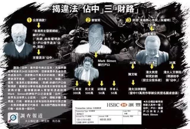 “黑金”輸送渠道并不復(fù)雜。例如所謂“占中”運動中,黎智英向馬克·西蒙開出逾一百萬元的支票,后者再透過名下的匯豐戶口開票予李卓人和梁國雄,每人分得50萬港幣。