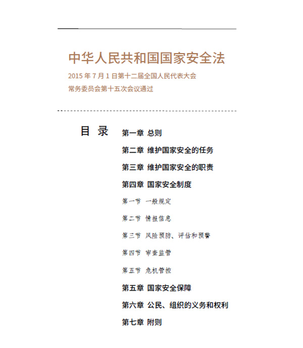 第三條 國(guó)家安全工作應(yīng)當(dāng)堅(jiān)持總體國(guó)家安全觀,以人民安全為宗旨,以政治安全為根本,以經(jīng)濟(jì)安全為基礎(chǔ),以軍事、文化、社會(huì)安全為保障,以促進(jìn)國(guó)際安全為依托,維護(hù)各領(lǐng)域國(guó)家安全,構(gòu)建國(guó)家安全體系,走中國(guó)特色國(guó)家安全道路。
