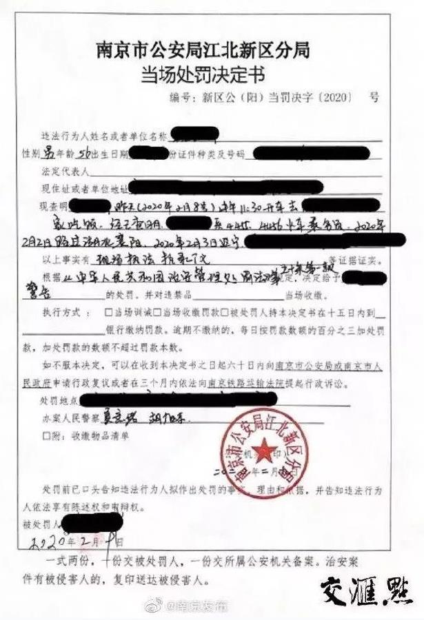 2月9日,江蘇南京開出首張居家隔離人員違規(guī)處罰單。